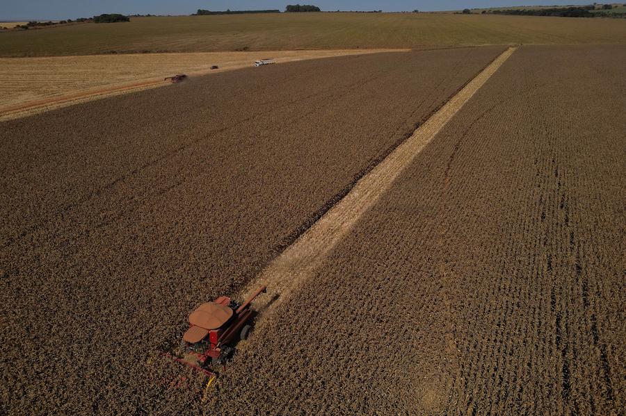 Imagen aérea tomada con un dron del 2 de julio de 2024 de una máquina agrícola cosechando maíz en la granja Nativa, en el Núcleo Rural Buriti Vermelho, en Brasilia, Brasil.…