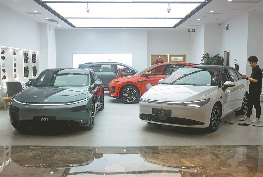 Xpeng en Hangzhou, provincia de Zhejiang, exhibe sus autos P7i, P5, entre otros modelos.…