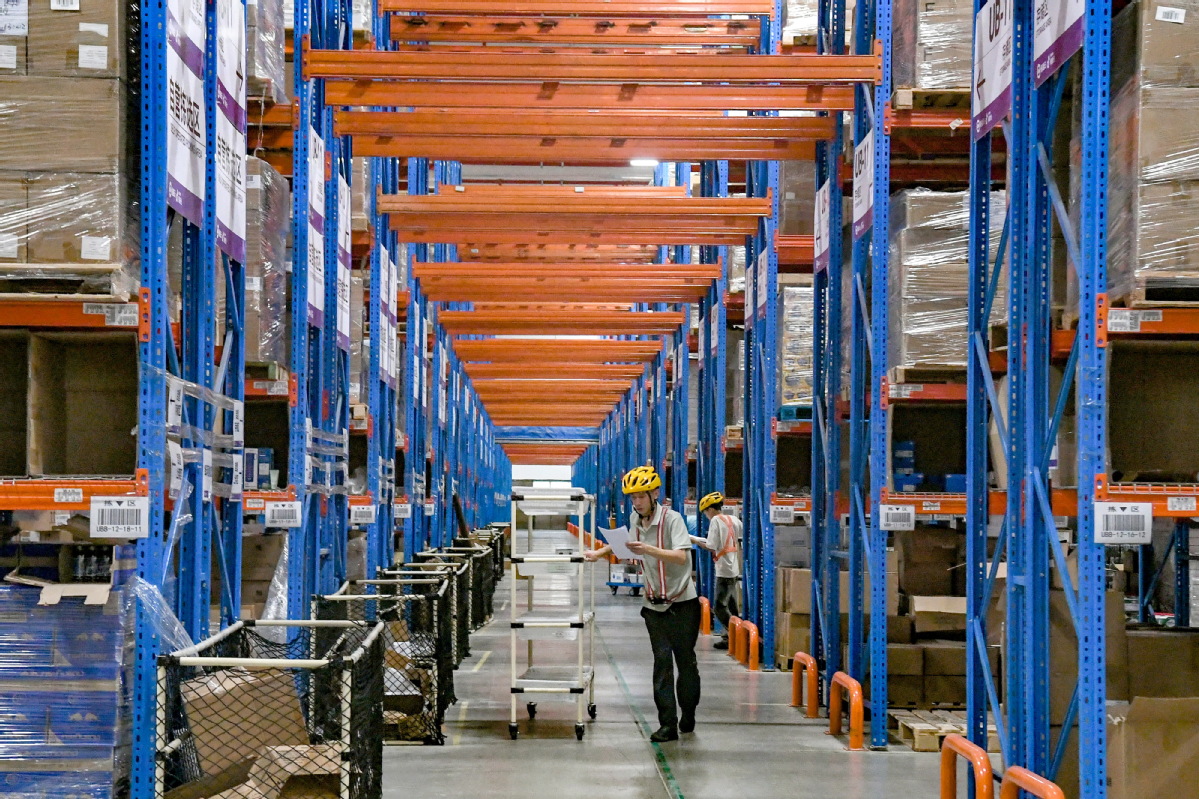 Empleados clasifican mercancías en un centro logístico de comercio electrónico transfronterizo en Jinhua, provincia de Zhejiang.…