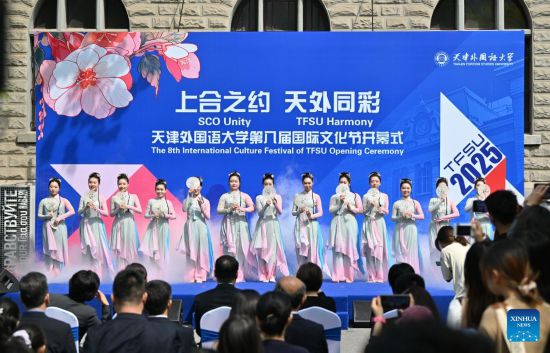 TIANJIN, 20 abril, 2025 (Xinhua) -- Imagen del 20 de abril de 2025 de una presentación escenificada durante el 8° Festival Internacional de Cultura de la Universidad de Estudios Extranjeros, en Tianjin, en el norte de China.…