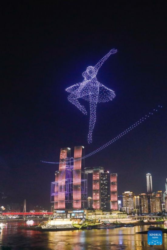 CHONGQING, 20 abril, 2025 (Xinhua) -- Imagen del 19 de abril de 2025 de un espectáculo de luces con drones visto, en el distrito de Nan'an, en la municipalidad de Chongqing, en el suroeste de China.…