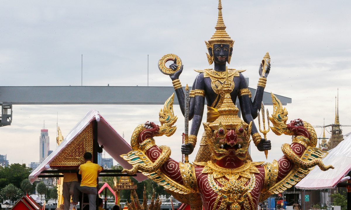 Funcionarios del Departamento de Bellas Artes de Tailandia instalan una decoración en la barcaza real en el Astillero Naval Real Tailandés de Bangkok, el 24 de julio de 2024.…