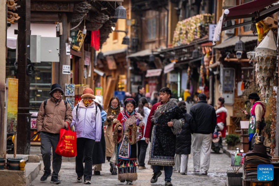 Turistas visitan la antigua ciudad de Dukezong en Shangri-La, la prefectura autónoma tibetana de Dechen, en la provincia de Yunnan, 7 de marzo de 2025.…