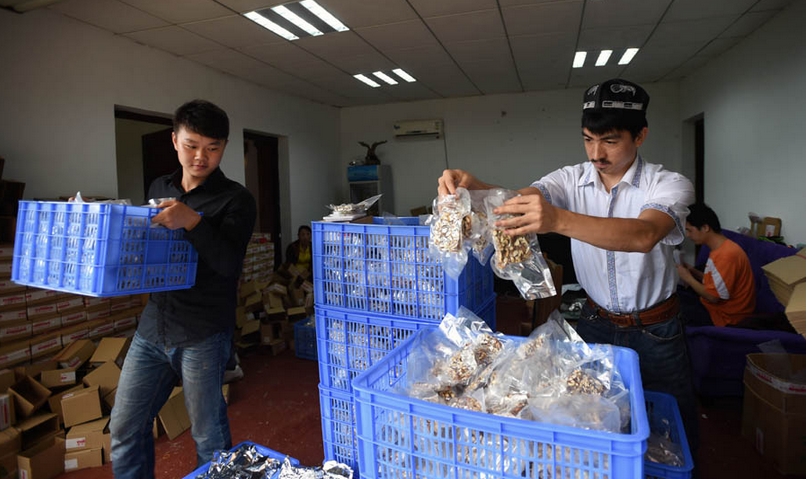 Adili y Jiang Chunyang envasan los paquetes de Qiegao en el taller de Changsha, en la provincia de Hunan, el 22 de mayo de 2014. [Foto/Xinhua]