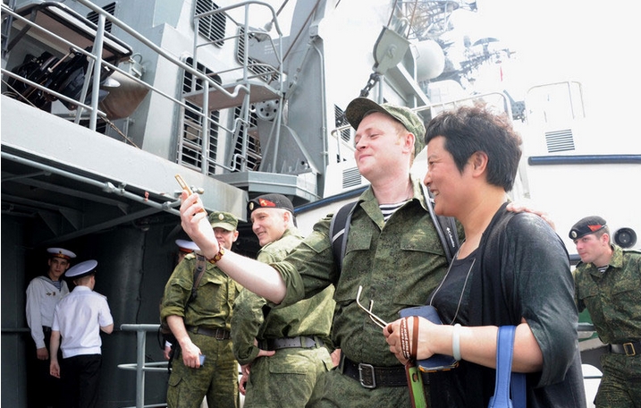 Un miembro de la tripulación del buque Varyagse hace un selfie con una visitante el lunes. [Foto/IC]