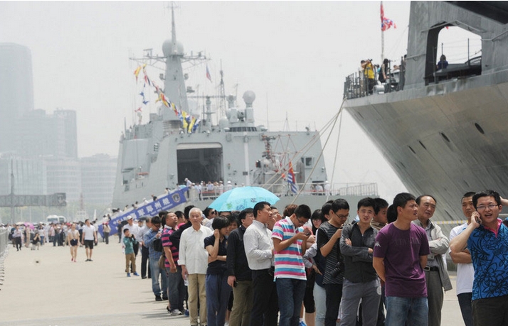27/05/2013 (El Pueblo en Línea) - Los visitantes esperan para subirse al destructor de misiles chino Zhengzhou, al fondo, y el barco de guerra ruso Varyag, en la terminal de cruceros del puerto internacional de Shanghai el lunes. Los dos buques están abiertos al público desde el lunes en Shanghai. El sábado, las fuerzas navales chinas y rusas concluyeron un simulacro de combate en el mar de China oriental. Un total de 14 buques de guerra, dos submarinos, nueve aviones y seis helicópteros de ambos países participaron en el ejercicio de tres días titulado Joint Sea-2014. [Foto/IC]
