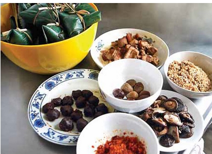 7. Agregue el arroz glutinoso a la salsa en la sartén y freír mezclando bien. Retirar el arroz del fuego y agregue los ajos chalotes fritos crujientes.