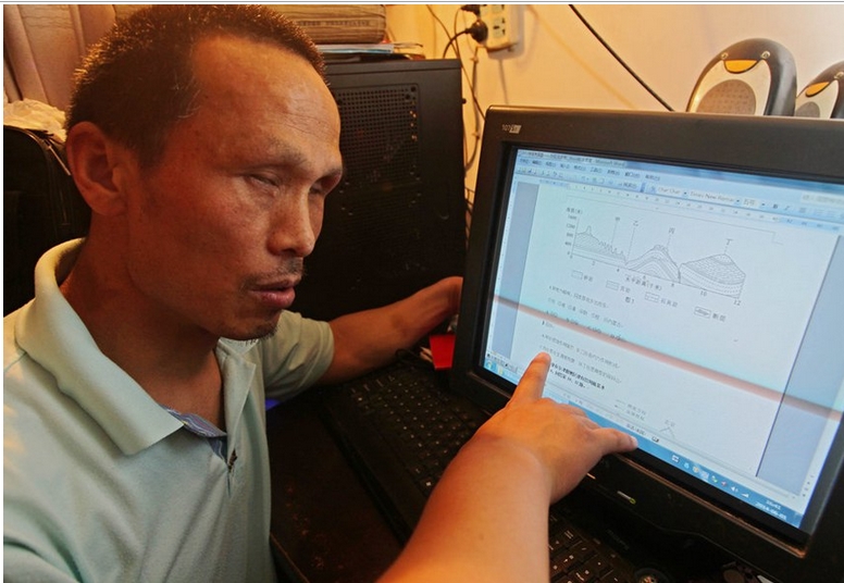 Voluntarios ayudan a Li Jinsheng a prepararse para el gaokao mediante la lectura de tablas y gráficos, el 1 de junio. [Foto/CFP]