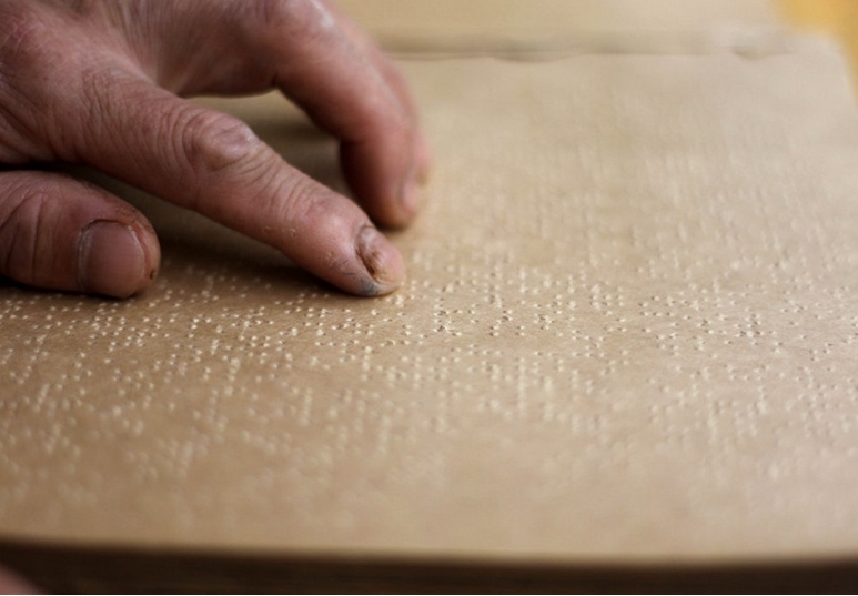 Li Jinsheng se prepara para el gaokao mientras intenta leer una revista en Braille, en Zhumadian, provincia de Henan, el 2 de junio. Solicitó hacer el examen con un audio pero aún no ha recibido respuesta y por lo que tendrá que hacer la prueba en Braille. [Foto/CFP]