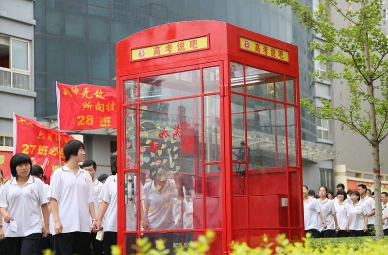 Los estudiantes pasan por delante de la cabina del centro de secundaria Hengshui City No.2 de la provincia de Hebei, el 2 de junio de 2014. [Foto/CFP]