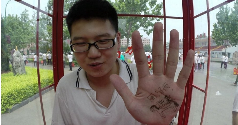Un joven ense?a a la cámara su mano con un slogan de ánimo, el 2 de junio de 2014. [Foto/CFP]