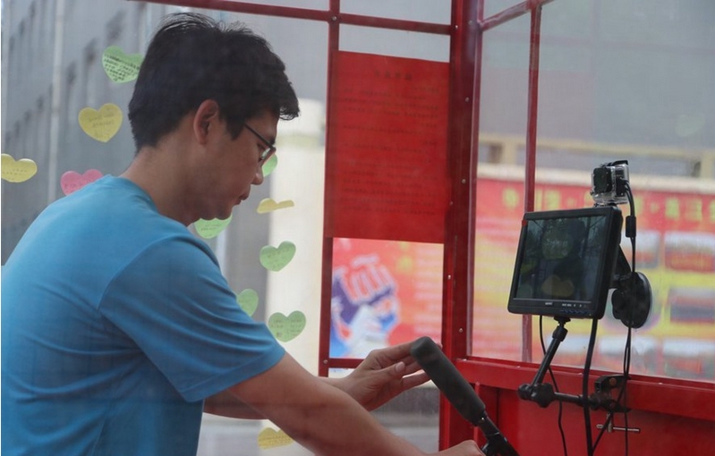 Un personal de mantenimiento del centro de secundaria Hengshui City No.2 examina una cabina, el 2 de junio de 2014. [Foto/CFP]