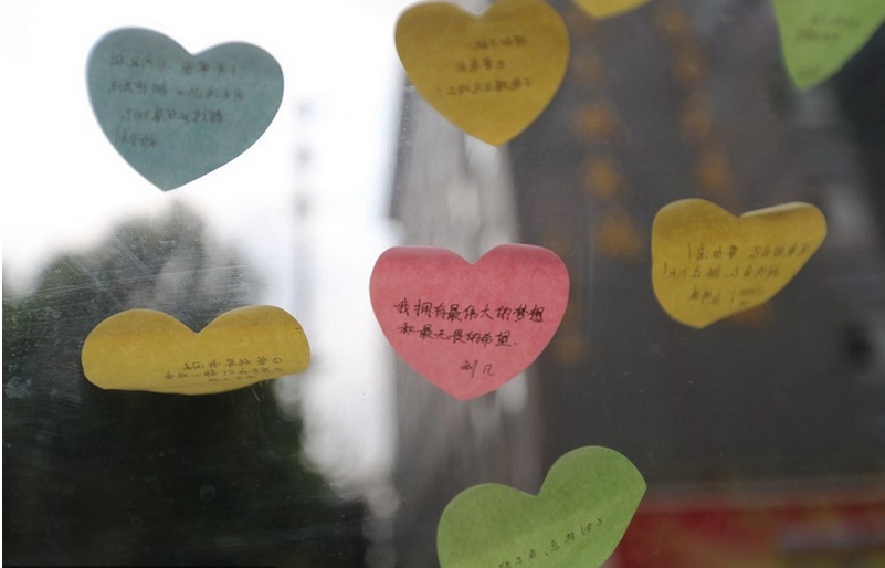 Notas con mensajes de ánimo pegadas al cristal de una cabina, el 2 de junio de 2014. [Foto/CFP]