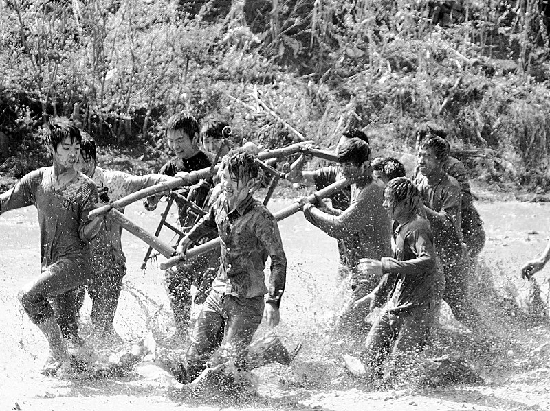 Los jóvenes de la minoría Dong en la provincia de Guizhou organizan anualmente una pelea de barro durante el periodo “Grano de Espiga”. En este día los recién casados, acompa?ados de sus amigos, plantan arroz juntos. Mientras plantan el arroz, se lanzan barro los unos a los otros. Al final de esta actividad, quien tenga más barros será el más popular