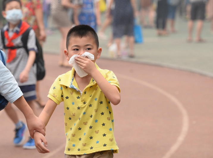 Un ni?o se cubre la cara con una servilleta de papel en Wuhan, el jueves, un día en que la contaminación del aire de la ciudad alcanzó un nivel peligroso, el 12 de junio. [Fotografía de Jin Siliu/Asianewsphoto]