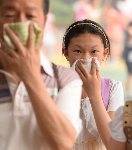 La gente se cubre la cara en Wuhan, el jueves, un día en que la contaminación del aire de la ciudad alcanzó un nivel peligroso, el 12 de junio. [Fotografía de Jin Siliu/Asianewsphoto]