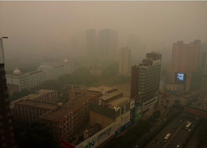 La ciudad está cubierta por una densa nube, el jueves 12 de junio de 2014. [Fotografía de Jin Siliu/Asianewsphoto]