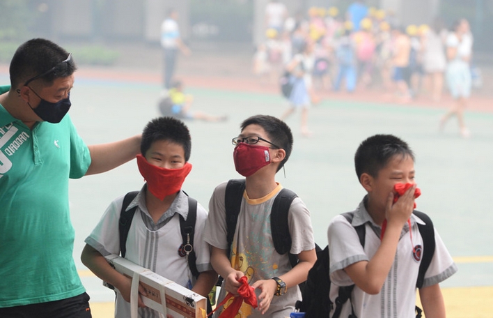 13/06/2014 (El Pueblo en Línea) - Tres alumnos y un hombre se cubren la cara con pa?uelos y máscaras en Wuhan, el jueves, un día en que la contaminación del aire de la ciudad alcanzó un nivel peligroso, en la provincia de de Hubei. El principal contaminante, según los informes, proviene de la quema de hierbajos en los alrededores de Wuhan. El primer ministro chino, LiKeqiang, declaró la "guerra" a la contaminación en marzo, durante la inauguración de las Dos Sesiones de China, prometiendo medidas para hacer frente a este problema tan grave de China. [Fotografía de Jin Siliu/Asianewsphoto]