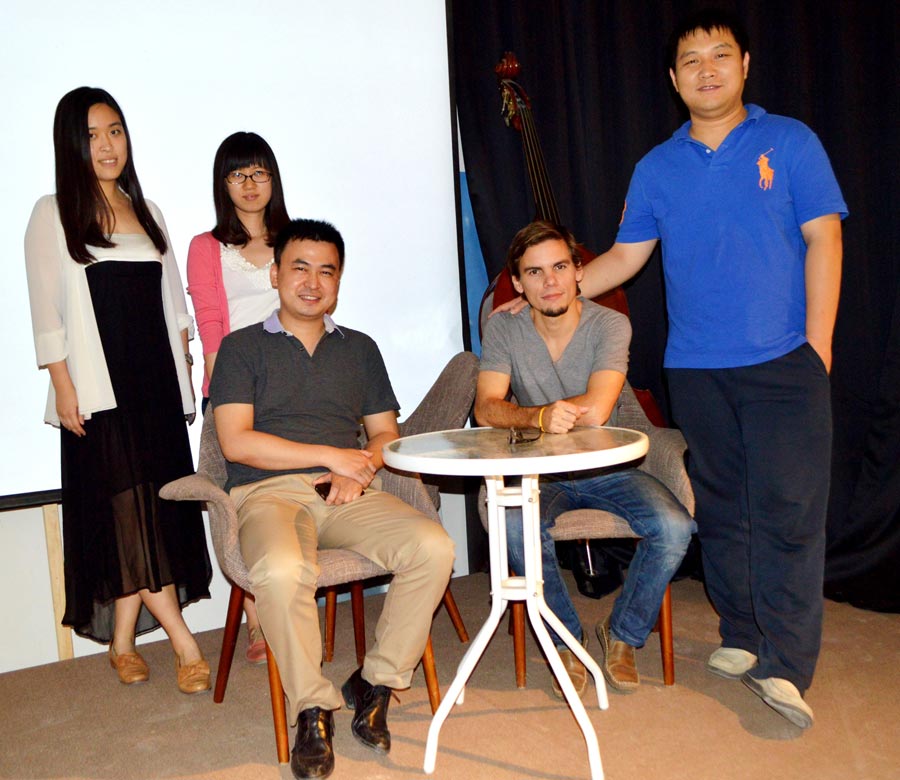 El artista visual cubano Asniel “Chuli” Herrera, junto al grupo organizador de “Meet in Beijing”. A su derecha, sentado, Benjamín Yi.