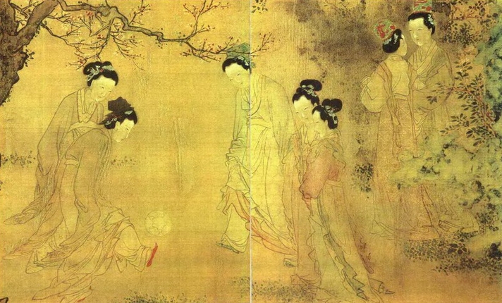 La pintura "Las criadas" de Du Jin de la dinastía Ming (1368-1644) muestra a varias mujeres jugando al cuju. [Foto/cms.smejs.com]