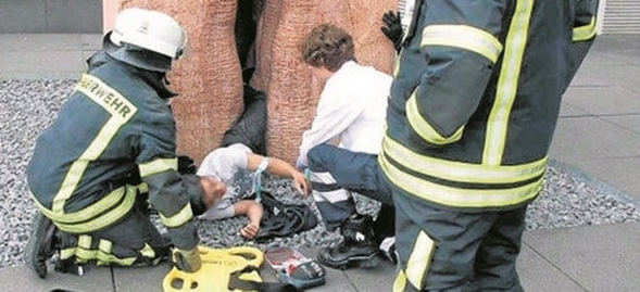Los servicios de rescate tuvieron que subir al estudiante en una camilla y elevarlo para que pudiera sacar las piernas de la escultura del peruano Fernando de la Jara instalada hace 13 a?os en un parque frente al Instituto de Microbiología y Virología de la clínica universitaria de Tubinga.