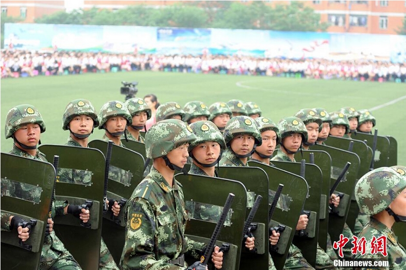 El primer grupo antiterrorista y antimotines de China realiza un simulacro en el campus de la Facultad East Star Airlines Travel de Chengdu el0 de junio de 2014. El equipo consta de 80 ni?os y 40 ni?as, todos estudiantes de la facultad. [Foto/chinanews.com]