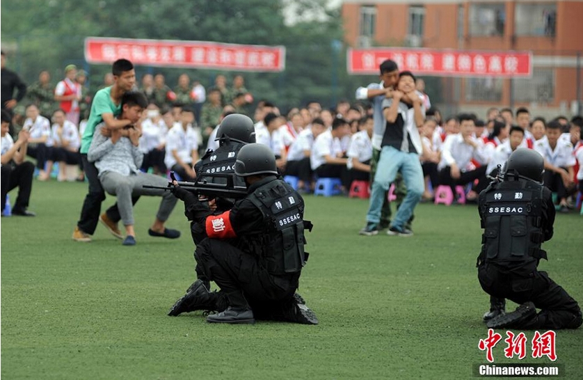 El primer grupo antiterrorista y antimotines de China realiza un simulacro en el campus de la Facultad East Star Airlines Travel de Chengdu el0 de junio de 2014. El equipo consta de 80 ni?os y 40 ni?as, todos estudiantes de la facultad. [Foto/chinanews.com]