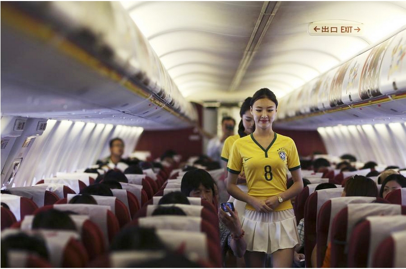 Jóvenes azafatas ataviadas con la camiseta del equipo de fútbol de Brasil recorren el avión, 23 de Junio 2014. [Foto/Agencias]