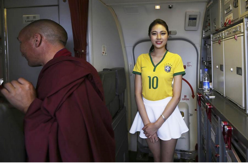 Kunming, 24/06/2014(El Pueblo en Línea)- Una azafata, que lleva una camiseta del equipo de fútbol de Brasil, le da la bienvenida a los pasajeros, Kunming, Yunnan, 23 de junio 2014. [Foto/agencias]