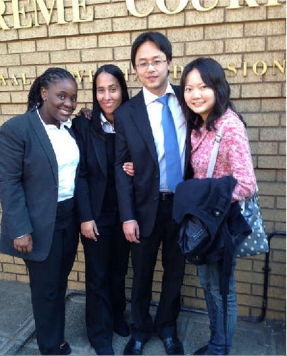 Po An-you (segundo a la derecha) el día se convirtió en un notario público Junto a sus amigos a la entrada de la Corte Suprema de Gauteng del norte, en Sudáfrica