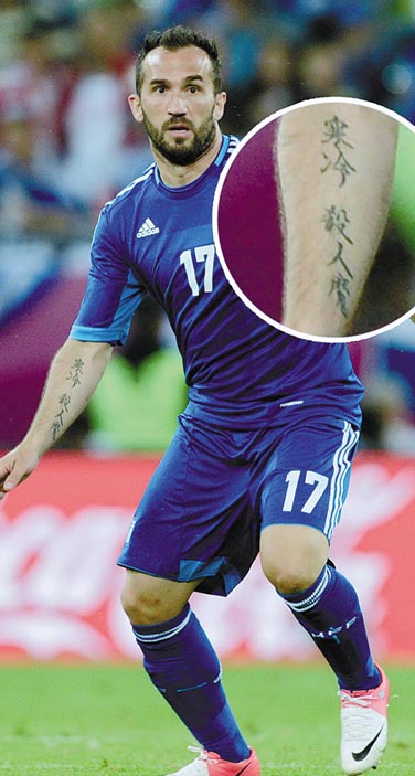 El delantero griego se ha tatuado en caracteres chinos "Sangre fría para matar al demonio", sin embargo falló el último penalti contra Costa Rica y Grecia fue eliminada del Mundial Brasil 2014.