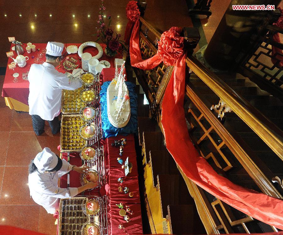 Los trabajadores están ocupados preparando la celebración del 150 aniversario del restaurante de pato laqueado Quanjude de Qianmen, en Pekín, el 2 de julio de 2014.
