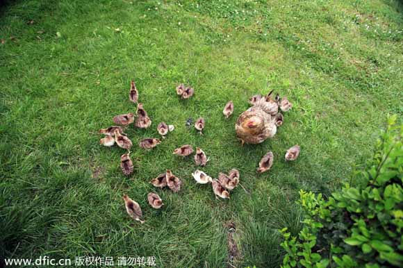 Una gallina se encarga de unos polluelos de pavo real en el parque Jiangnan, el 8 de julio de 2014. Varias gallinas están a cargo de incubar y cuidar de los polluelos de otras aves. [Foto/IC]
