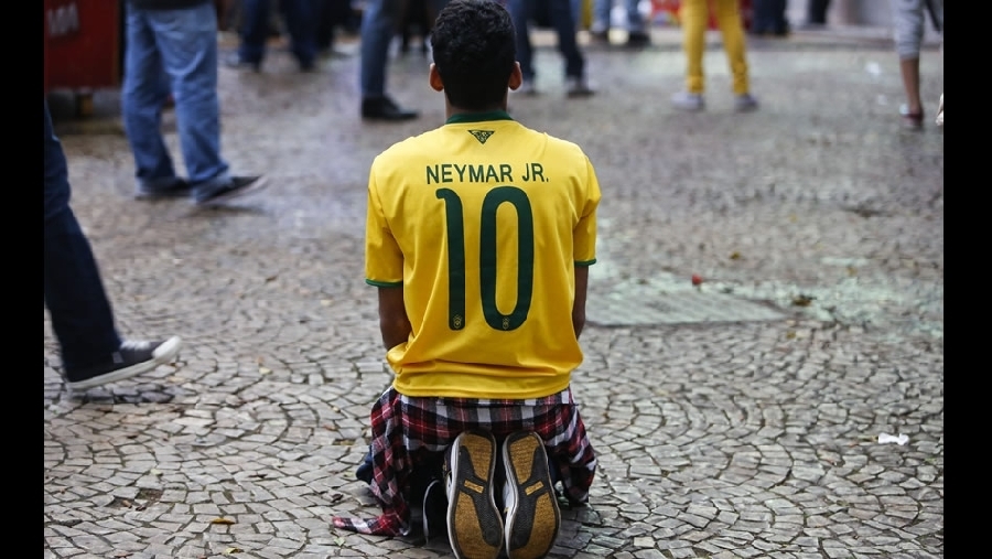 Un joven permanecía hincado mientras veía el partido en Sao Paulo, portaba la playera de Neymar, la gran ausencia de la selección.