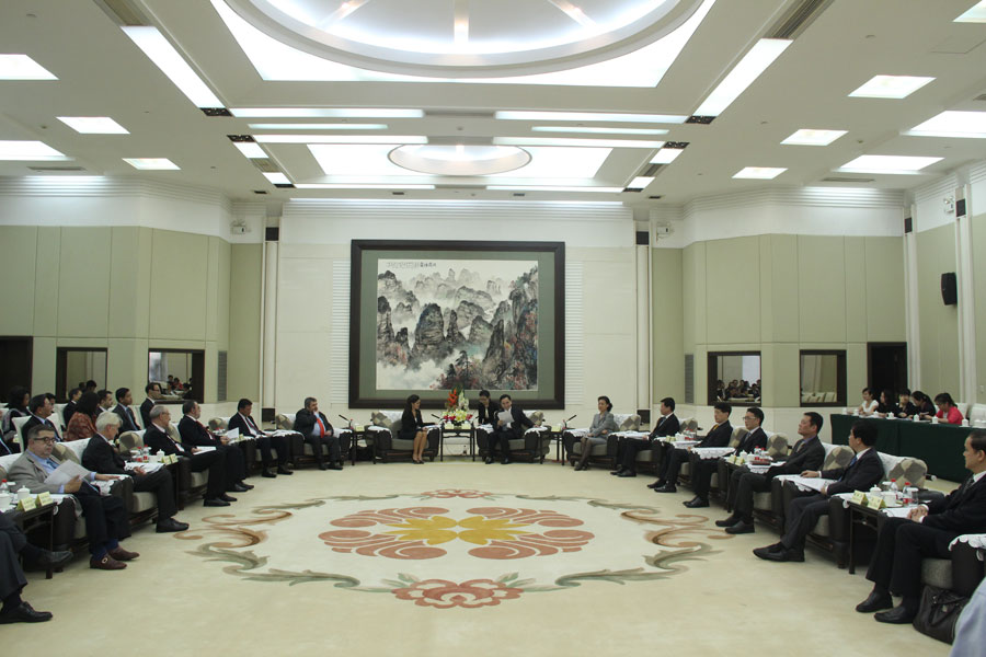Reunión de diplomáticos de la provincia de Guangdong encabezada por el gobernador de dicha provincia, Zhu Xiaodan, y la consul de Ecuador en Guangzhou, Mariella Molina.