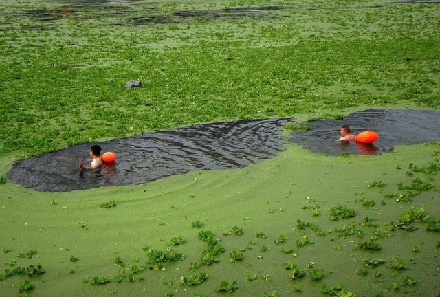Wuhan, 14/07/2014(El Pueblo en Línea)- Plantas acuáticas como las lentejas de agua, que han bajado desde los tramos superiores del Río Han, siguen vivas después de un mes, sin se?ales de disminuir. La foto muestra a los ciudadanos nadando en un tramo del río.
