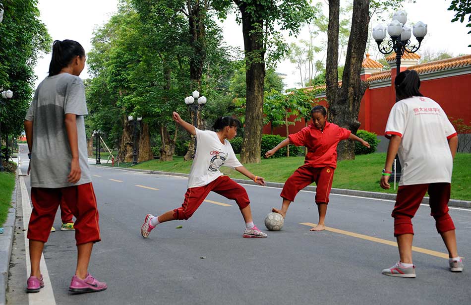 Estudiantes ni?as juegan al fútbol en la escuela de fútbol Evergrande de Guangdong.