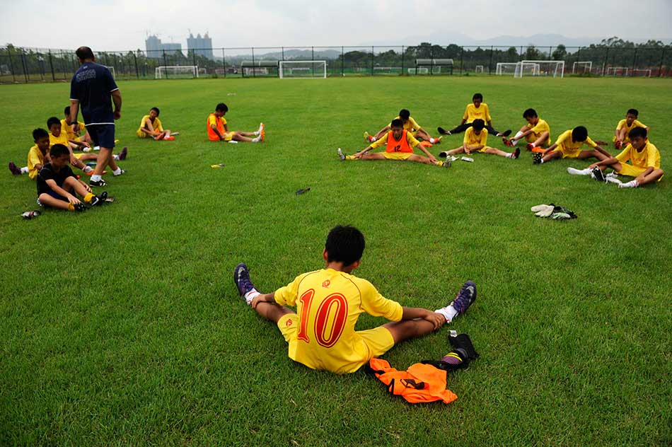 Los estudiantes realizan estiramientos en el campo de la escuela de fútbol Evergrande de Guangdong.