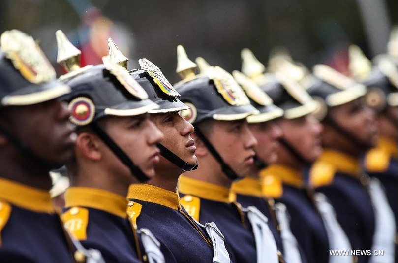 Cadetes de las fuerzas armadas participan en el desfile militar anual para conmemorar el Día de la Independencia, en la ciudad de Bogotá, capital de Colombia, el 20 de julio de 2014. (Xinhua/Jhon Paz)