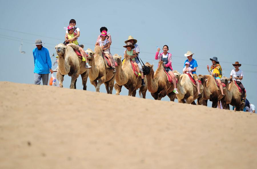Los turistas montan a camello en el área escénica del Lago Shahu en región autónoma Hui de Ningxia, el 27 de julio de 2014. Comienza la temporada de verano, y durante este periodo, el Lago Shahu y los humedales del desierto esperan recibir 20.000 visitas turísticas al día.