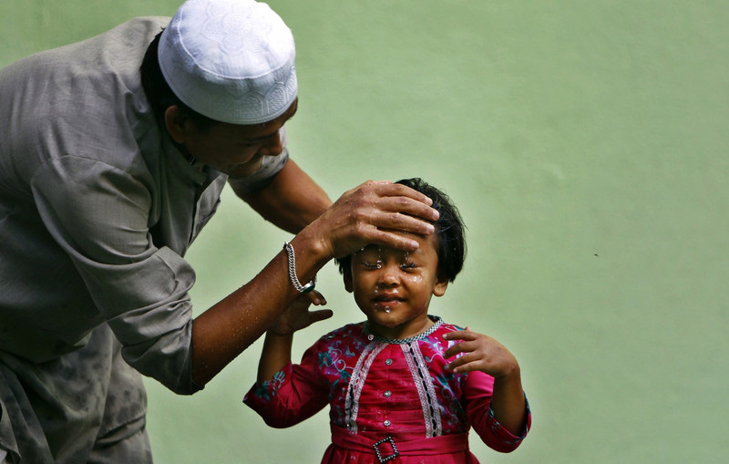 Un musulmán nepalí lava la cara de su hija antes de las oraciones del Eid al-Fitr en una mezquita de Katmandú, Nepal, el 29 de julio de 2014.