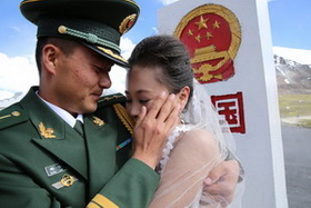 Un novio seca las lágrimas de su novia. Algunos soldados han tenido que retrasar su boda debido al trabajo. [Fotografía por QianqingTang / para chinadaily.com.cn]