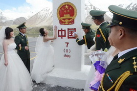 Pekín, 01/08/2014(El Pueblo en Línea)-Cinco parejas se han casado en el puesto fronterizo número 7 de Khunjerab, en la región autónoma Uygur de Xinjiang, el 30 de julio de 2014. Los novios, que trabajan para la policía fronteriza de Khunjerab, han custodiando la frontera entre China y Pakistán desde hace muchos a?os. [Fotografía por QianqingTang / para chinadaily.com.cn]