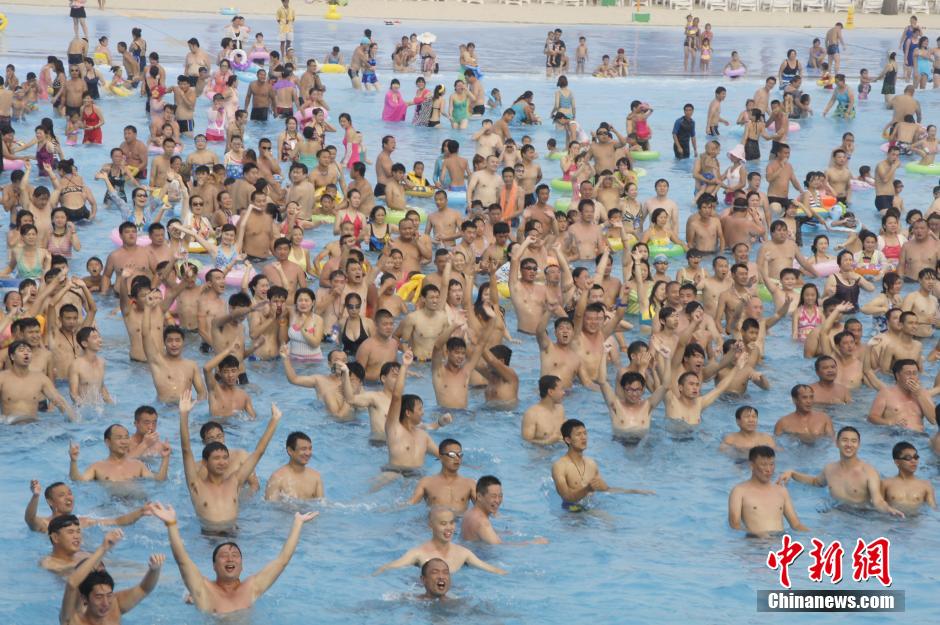 Tianjin, 04/08/2014(El Pueblo en Línea)-Debido al sofocante calor, el 3 de agosto el Parque Acuático de Tianjin recibió casi cinco mil visitantes, máxima cifra para este verano. Aprovechando las vacaciones estudiantiles y el descanso de fin de semana, los residentes en Beijing, Tianjin, Hebei y otros lugares cercanos, gustan de visitar este parque acuático. Aquí se divierten, juegan entre las olas y disfrutan de la frescura del mundo acuático. La foto muestra el momento en que miles de visitantes bailan juntos “Little Apple”, una canción que recientemente se ha hecho muy popular en China. Bailar ayuda a olvidar el cansancio y disfrutar del placer de las sensaciones refrescantes. Reporta: Xinhua. (Foto: Zhang Daozheng)