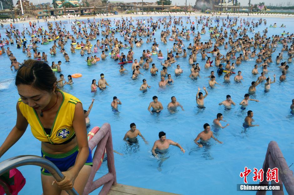 Tianjin, 04/08/2014(El Pueblo en Línea)-Debido al sofocante calor, el 3 de agosto el Parque Acuático de Tianjin recibió casi cinco mil visitantes, máxima cifra para este verano. Aprovechando las vacaciones estudiantiles y el descanso de fin de semana, los residentes en Beijing, Tianjin, Hebei y otros lugares cercanos, gustan de visitar este parque acuático. Aquí se divierten, juegan entre las olas y disfrutan de la frescura del mundo acuático. La foto muestra el momento en que miles de visitantes bailan juntos “Little Apple”, una canción que recientemente se ha hecho muy popular en China. Bailar ayuda a olvidar el cansancio y disfrutar del placer de las sensaciones refrescantes. Reporta: Xinhua. (Foto: Zhang Daozheng)