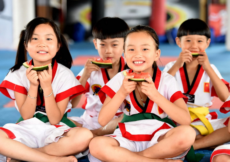 Un grupo de ni?os comen sandías en un jardín de la infancia de Anhui, Haozhou. Comer sandía obedece a una antigua tradición popular de bienvenida para un feliz comienzo del oto?o. El Liqiu, uno de los 24 términos solares tradicionales chinos, es el que marca el comienzo del oto?o. La gente también suele comer duraznos. Al comer el fruto, se augura una pronta despedida del verano y la llegada fresca y cómoda de la siguiente estación.