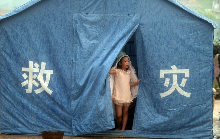 Una ni?a se asoma para ver la lluvia en una carpa improvisada en Longtoushan, condado de Ludiang, provincia de Yunnan, el 7 de agosto de 2014.[Foto/IC]
