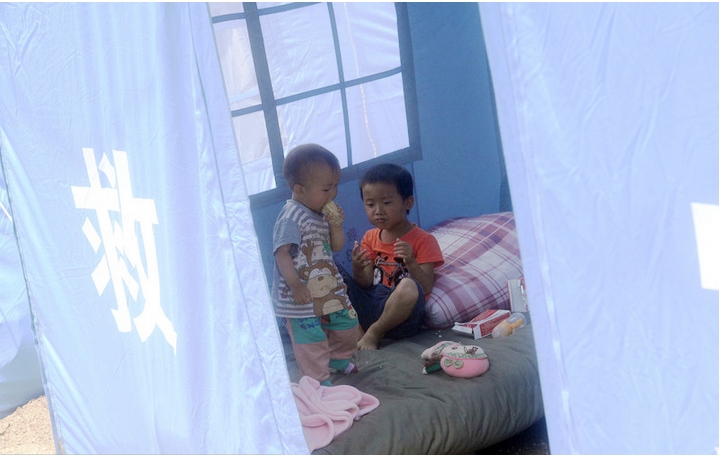 11/08/2014 (El Pueblo en Línea) - Dos ni?os juegan dentro de una carpa improvisada en el condado de Ludiang, provincia de Yunnan, el 7 de agosto de 2014. Los ni?os son los que más secuelas psicológicas pueden sufrir después del terremoto de 6,5 grados de magnitud que se cobró 617 vidas e hirió a más d e3.000 personas en una zona remota de la provincia de Yunnan. [Foto/IC]