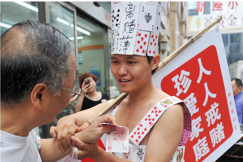 11/08/2014 (El Pueblo en Línea) -Un ex ludópata vestido con un traje hecho a base de cartas de póker lleva una pancarta en la que se puede leer "Ama a tu familia y aléjate de los juegos de azar". El ex adicto dio 100 yuanes (16 dólares) a los transeúntes que admitían no ser adictos en Chengdu, provincia de Sichuan, el miércoles. [Foto/Asianewsphoto]