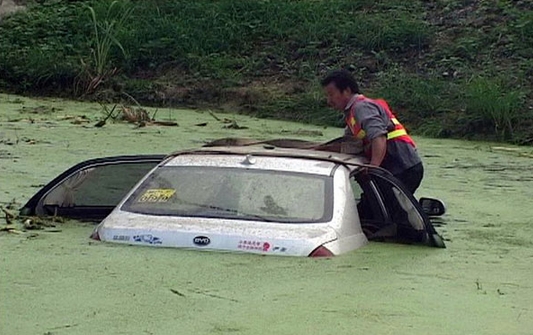 Un trabajador de la grúa ata el coche con unos arneses para sacarlo del río en Nanjing, provincia de Jiangsu, el 10 de agosto de 2014.[Foto/IC]